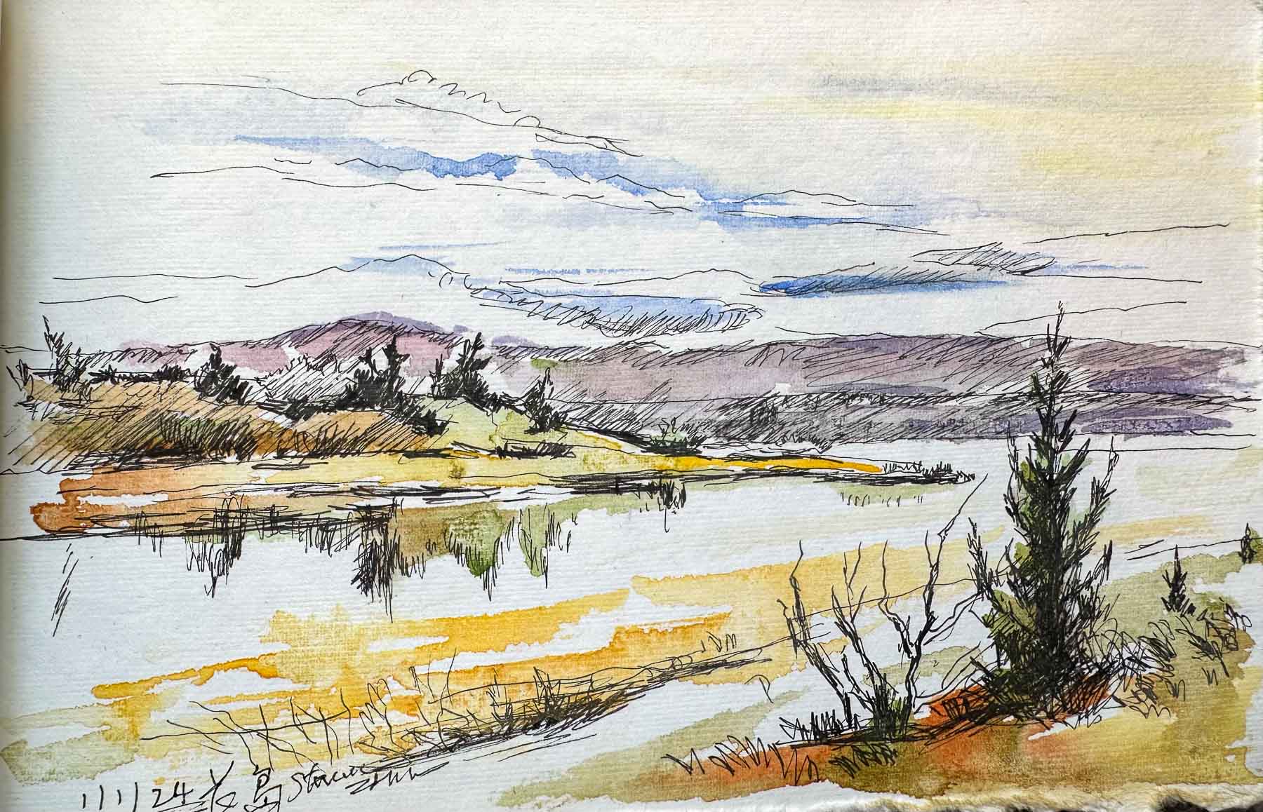 Paint on location in Long Island, New York on January 01, 2024. Pen and Wash. (5″x8″)